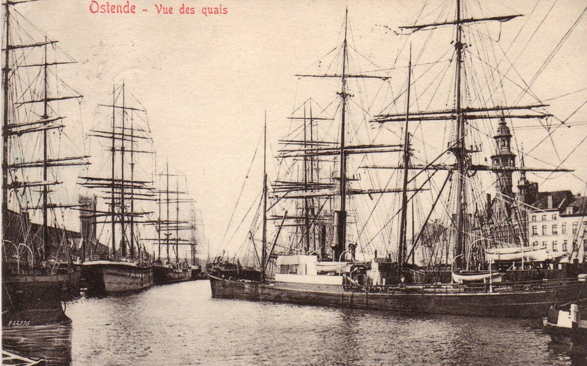 Edit. V.G. [=Victor Grégoire], 42, Avenue du Midi, Bruxelles. - Ostende - Vue des quais. - De handelsdokken gelegen langs de Keizerskaai. Rechts, het gebouw met het torentje is het Zeevaartcommissariaat, ook "Pilotage" genoemd. De grote zeilschepen met de aanvoer van kolen, hout en meststoffen uit Chili.