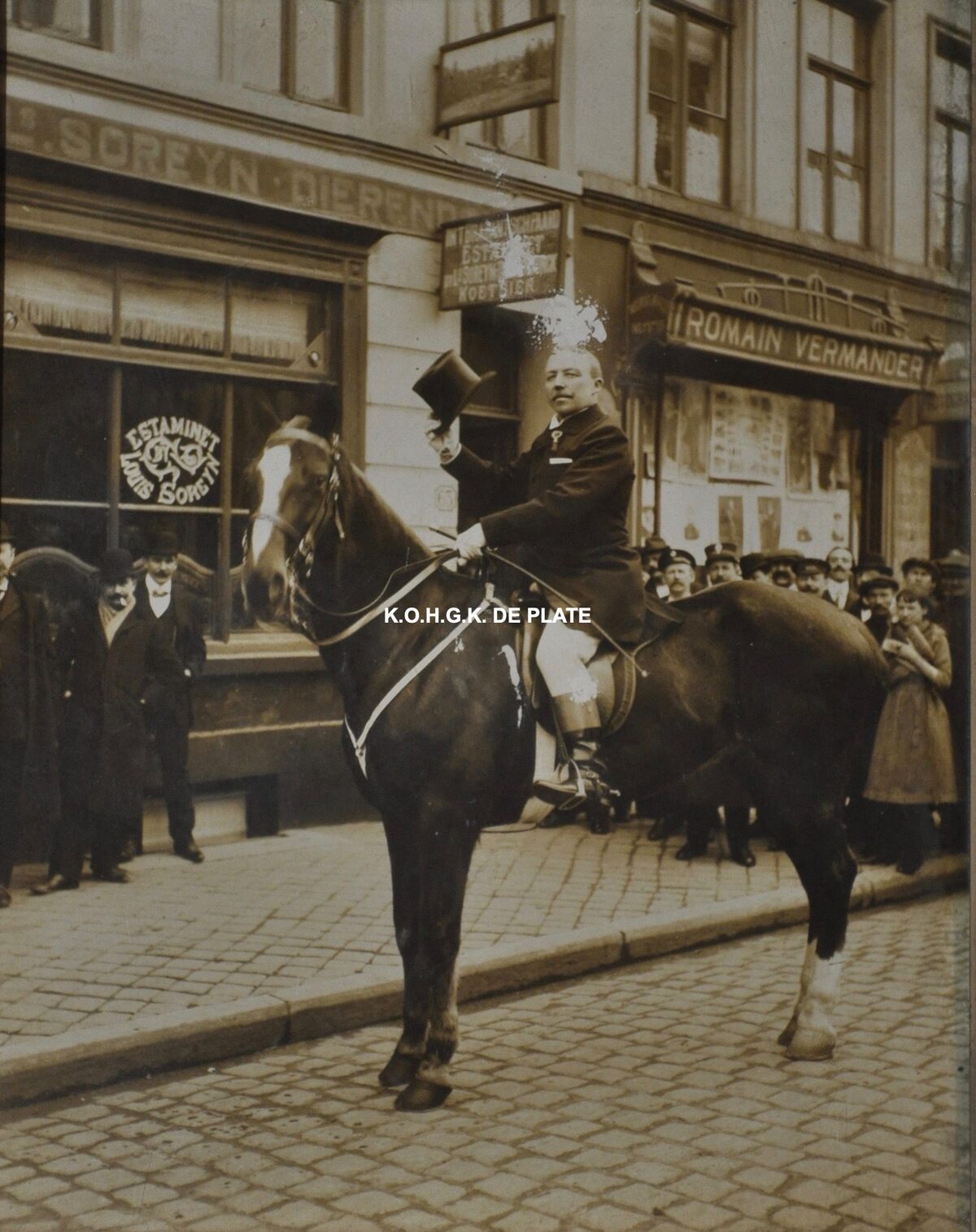 Formaat : 29 x 23,5 cm. Ere-voorzitter van de Ware Volksvrienden den heer Louis Soreyn-Elise Dierendonck (café-uitbater) te Oostende op zijn paard. Foto genomen op 3 maart 1913 voor estaminet Louis Soreyn op de Alfons Pieterslaan nr. 63 te Oostende