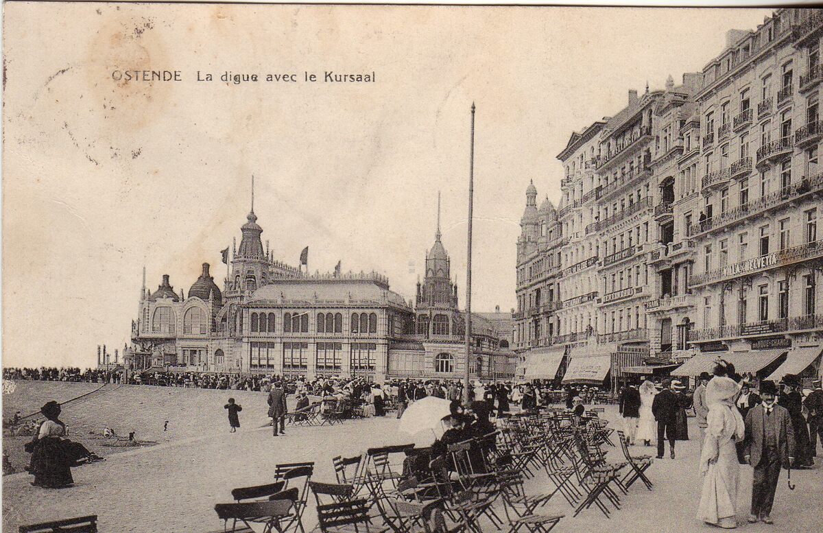 Oostende in de Belle Epoque. De Zeedijk en de grote hotels, met op de achtergrond, de westgevel van het derde Kursaal. Rechts, het hotel Helvetia met onderaan een wisselkantoor.