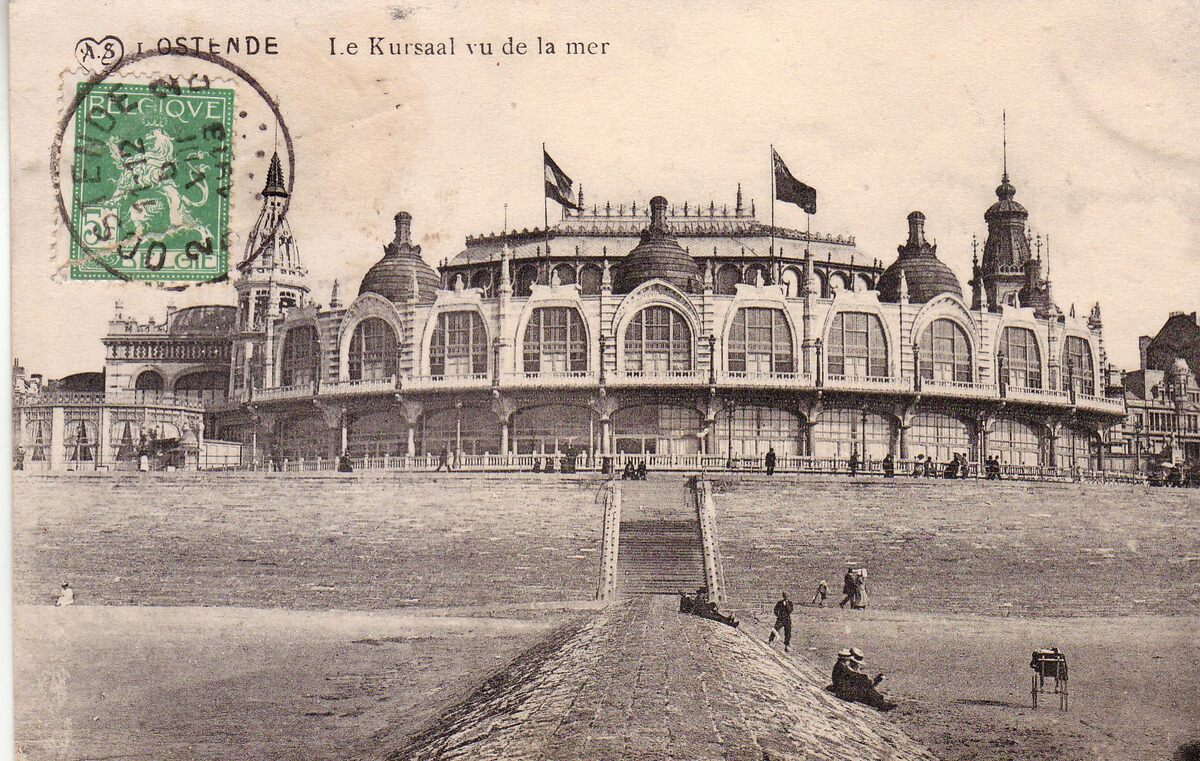 A.S., N° 1. [Scheers]. - Ostende - Le Kursaal vu de la mer. - De noordgevel van het derde Kursaal langs de Zeedijk, gezien vanaop een golfbreker op het Groot Strand.