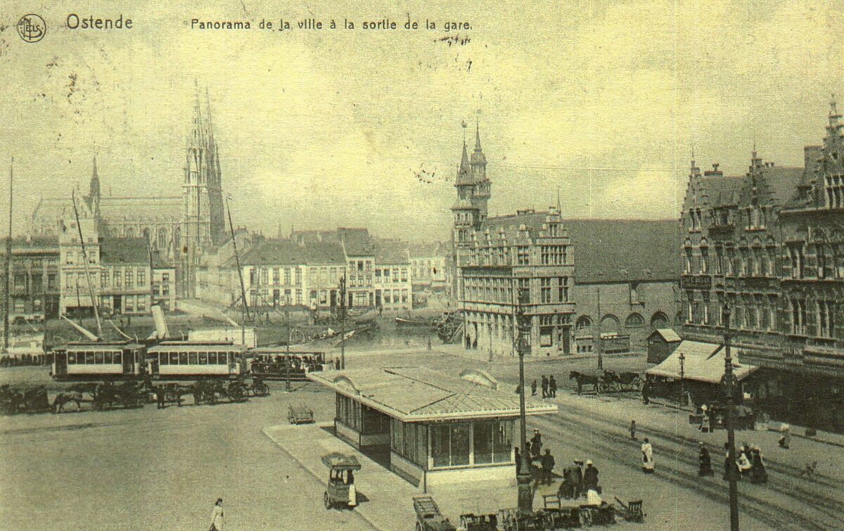De Vandersweepplaats op de wijk Hazegras. Onderaan rechts, het tramwachthuisje voor de kust- en stadstram. Een vrouw met ijscokar wacht op klanten. Wat verder wachten koetsiers op reizigers, want links is het tweede spoorwegstation van Oostende (Oostende-Stad). Rechts, met torentje, het politiebureau en aansluitend, de stedelijke opslagplaats. Op de achtergrond, de Keizerskaai en de Sint Petrus en Pauluskerk.