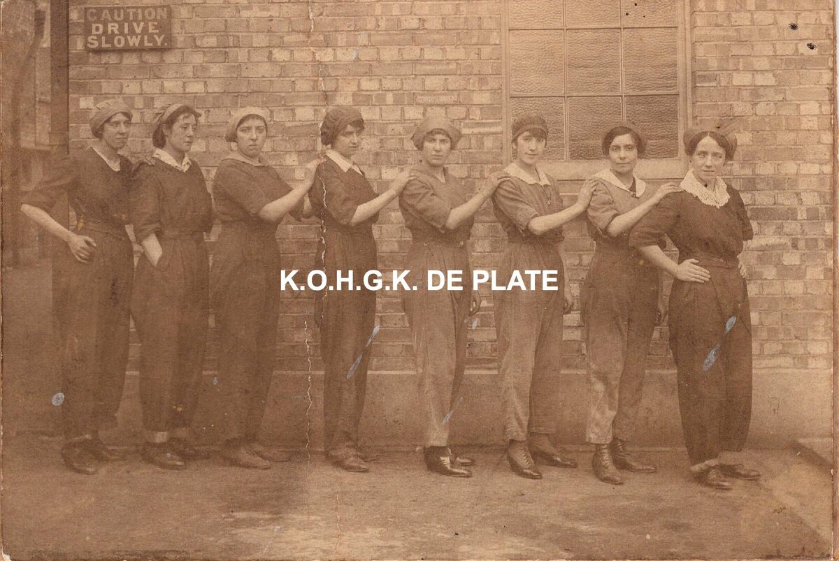 Belgische vrouwen tewerk gesteld in een fabriek in Exeter (Groot-Brittannië) gedurende de Eerste Wereldoorlog. De vijfde van links is mevrouw Helena Bauwens, geboren te Oostende in 1897.