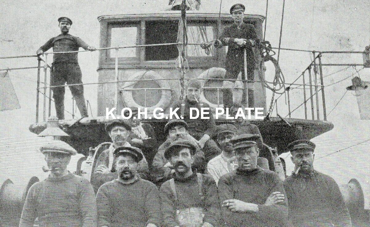 Fotoillustratie. - De bemanning van de O.131 "John", één van de treilers van de rederij "Pêcheries à Vapeur", met schipper Pierre Pincket (links op de brug) tijdens de Eerste Wereldoorlog. Rechts op de brug een Britse marine reserveofficier, de "Fighting Commanding Officer", die van zodra een vijandelijke boot in zicht kwam het bevel over de "visbak" overnam en het gevecht leidde. Bovendien was er een Britse matroos-kanonnier, John Pemberthy, die samen met Leon Allary (assistent kanonnier) instond voor de bediening van het kanon aan boord.