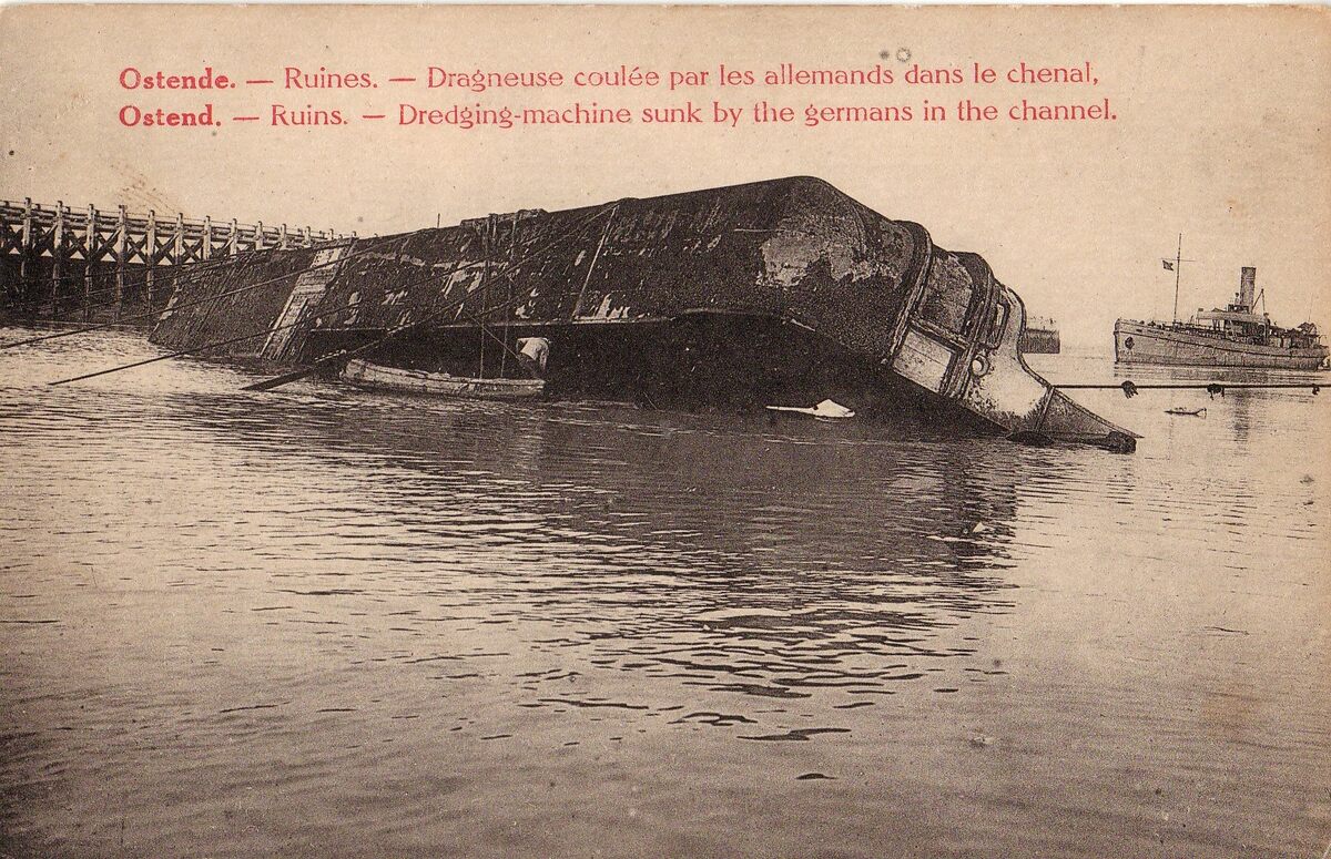 Phob/Phototypie Belge. - Ruines - Dragneuse coulée par les allemands dans le chenal. - Ostend - Ruines - Dredging machine sunk by the germans in the channel