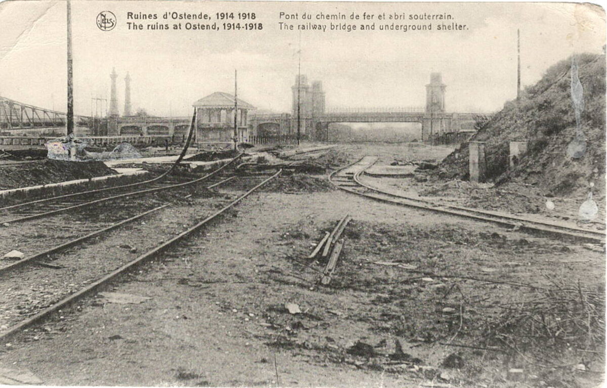 Nels. Edition J. Revyn, 14, rue du Canada, Bruxelles. - Ruines d'Ostende 1914-1918 - Pont du chemin de ver et abri souterrain. The ruins at Ostend 1914-1918 - The railway bridge and underground shelter. - Het Zeestation werd door de Duitsers niet intensief gebruikt. Na de zware schade opgelopen in 1917 werden vele delen van de metaalconstructies gesloopt en afgevoerd als schroot naar de hoogovens de de Duitse staalindustrie. De treinsporen werden, op één spoor na, opgebroken en gebruikt voor de aanleg van nieuwe en het herstel van beschadigde spoorlijnen.
