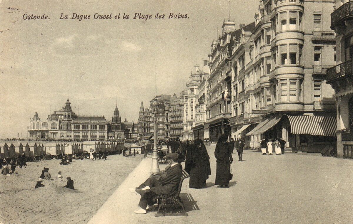Le Bon. - Ostende - La Digue Ouest et la Plage des Bains. - We zien de Zeedijk richting de westgevel van de derde kursaal. Links, het Groot Strand en de traditionele badkarren