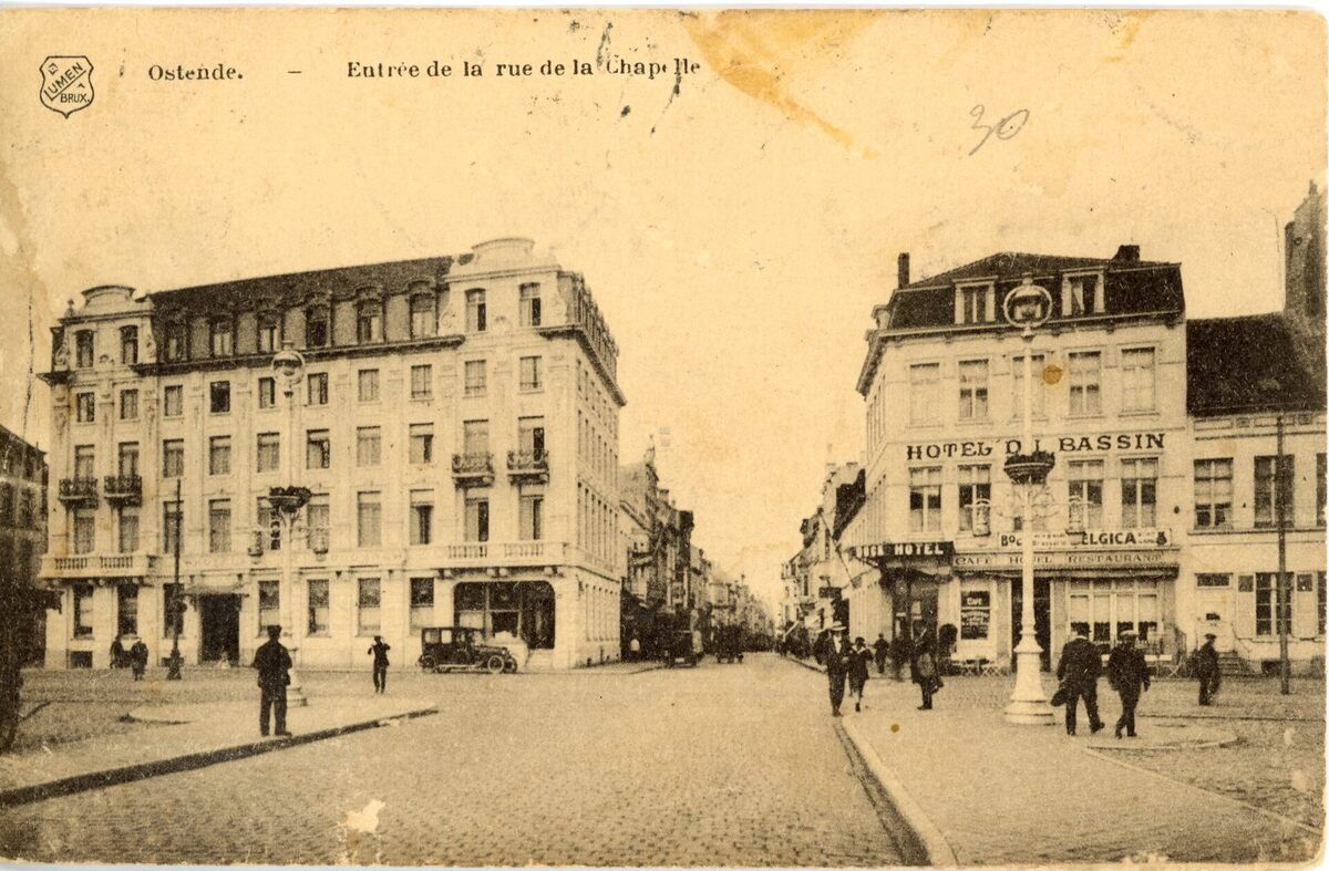 Lumen/G. Le Roy. -Entrée de la Rue de la Chapelle. Hotel du Bassin, nr. 15, had 14 kamers met lopend water, centrale verwarming en 1 badkamer en was het ganse jaar open.