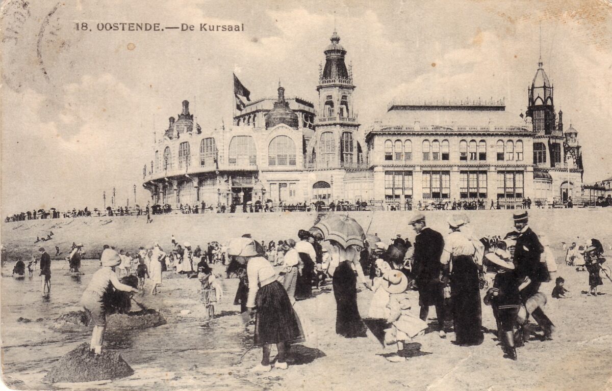 Strandrecreatie op het Groot Strand nabij de westelijke gevel van het derde Kursaal langs de Zeedijk
