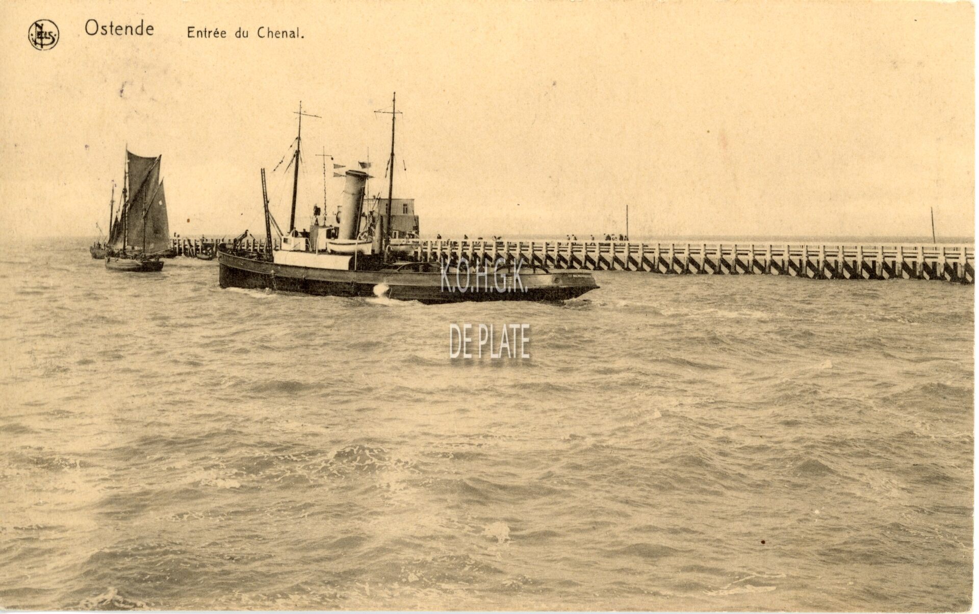 Nels/Tempère. - Ostende - Entrée du Chenal. - Een sleepboot en een Oostendse tweemastsloep verlaten de haven van Oostende. Rechts, het Ooststaketsel en tijseinpost.