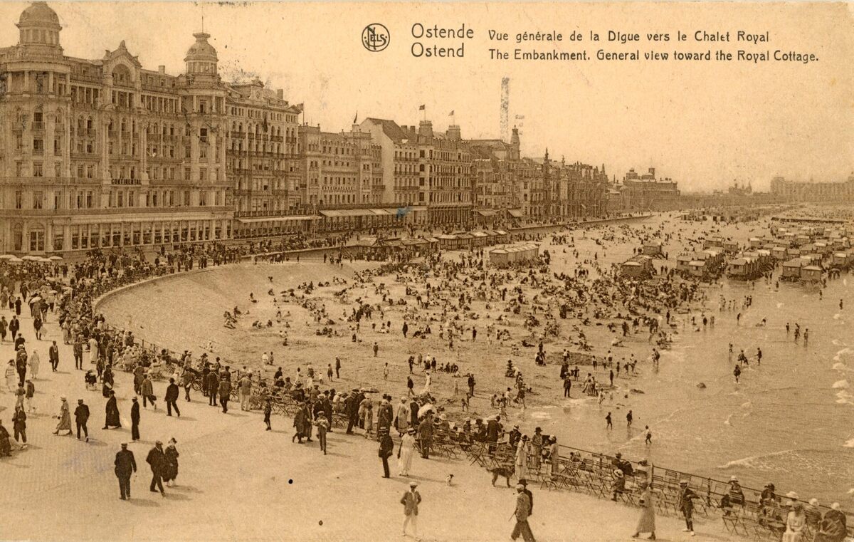De Zeedijk gezien ten westen van het Kursaal, richting het Koninklijk Chalet en op het einde het Royal Palace Hotel. Vooraan, strandrecreatie op het Groot Strand
