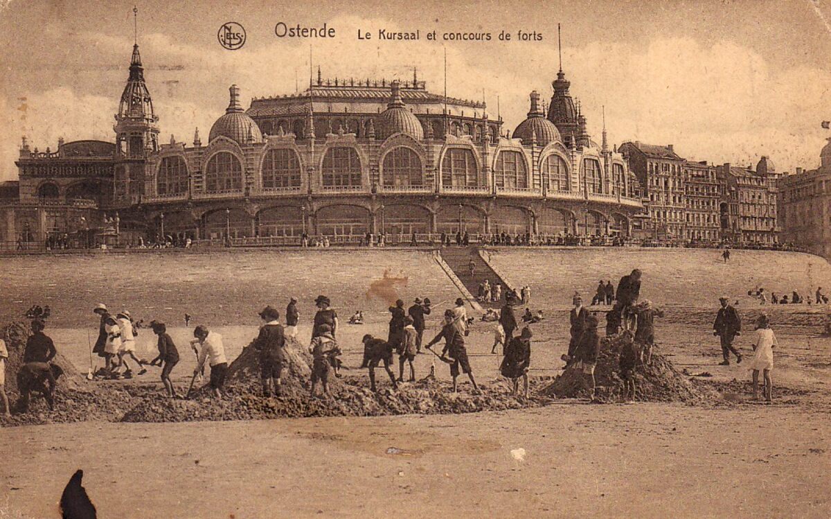 Nels. Ostende - Le Kursaal et concours de forts. De noordgevel en Zeedijk. Wedstrijd, dikwijls ingericht door de krant "Le Soir", wie het langst zijn fort (zandkasteel) standhoudt tegen de vloed.