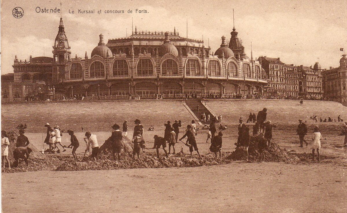 Nels. - Ostende - Le Kursaal et concours de Forts. - We zien de noordgevel van de derde kursaal. - Op het Groot strand is er een wedstrijd "forten" of zandkastelen bouwen.