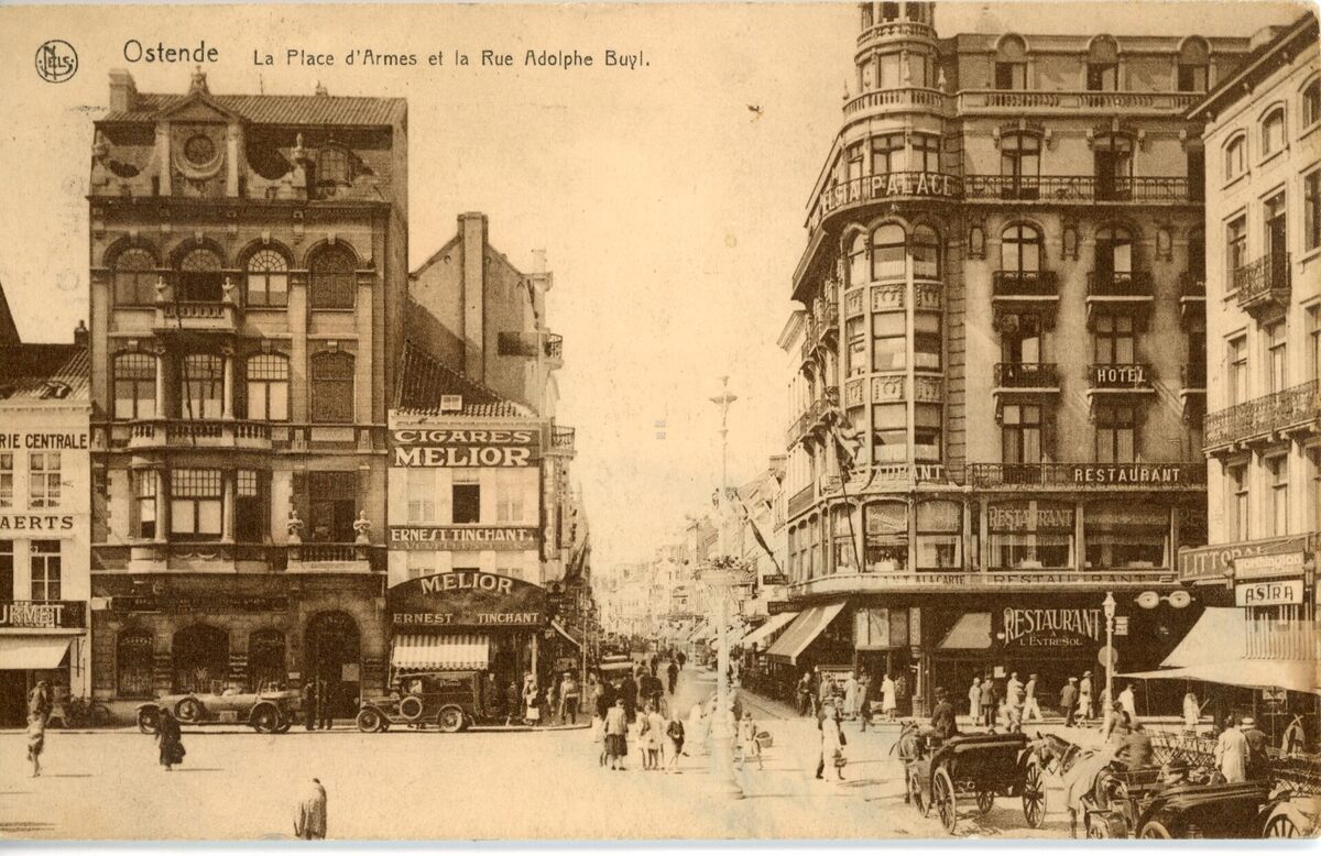 Nels 13, 28. - Ostende - La place d'armes et la rue Adolf Buyl. Het Excelsia Palace Hotel is in 2015 een schoenwinkel. De tabakswinkel Melior aan de overzijde van Ernest Tinchant is nu een pralinezaak van Neuhaus