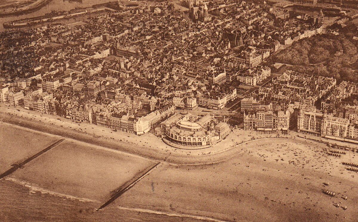 Luchtfoto van het groot strand en het derde Kursaal langs de Zeedijk en zijn grote hotels. Met zicht op het centrum van de stad.