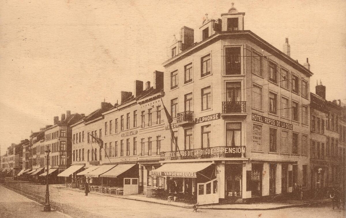 Formaat : 9 x 14 cm. - Montmerency, 6 Rue de l'Abrenvoir, Nantes. -Propriétaire A. Demulder. Vue sur la Mer et le Port. Maison ouverte toute l'année. Chauffage central. Grande Spécialité de Diners de Poissons. Huîtres - Homards - Luifelopschrift : Bières Vandenheuvel. Handelszaak gelegen op de hoek Langestraat en Visserskaai.