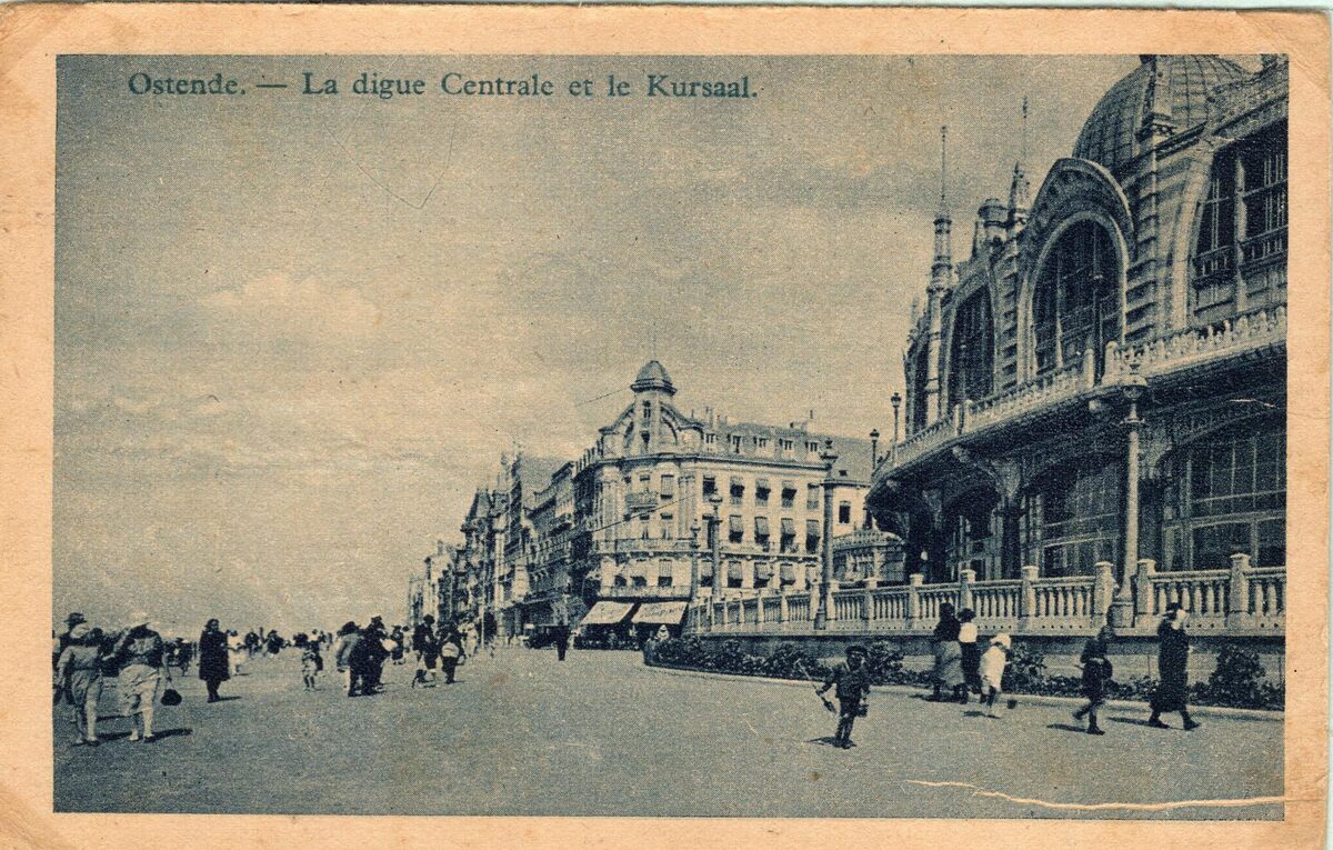 Ostende - La digue Centrale et le Kursaal. - Oostende in het interbellum. De Zeedijk gezien vanaf de derde Kursaal richting de havengeul. Op de hoek met de Kursaal-Oosthelling, het "Hôtel Royal Belge"