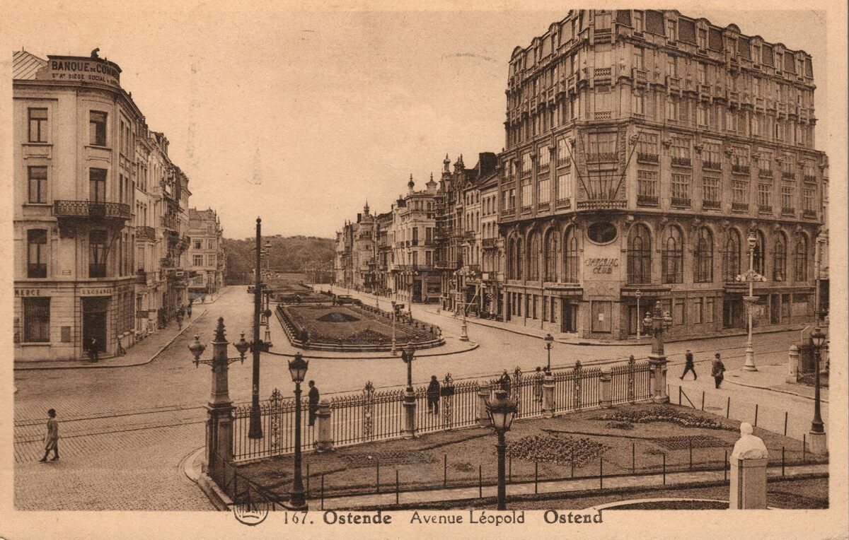 Albert, N° 167. - Ostende - Avenue Léopold. - De Leopoldlaan gezien vanuit de hovingen van het derde Kursaal, richting het Leopoldpark. Links, "Banque de Commerce", Leopoldlaan 29. Rechts, "Hotel Impérial", Van Iseghemlaan 70-72. Rechts onder, het borstbeeld van James Ensor.