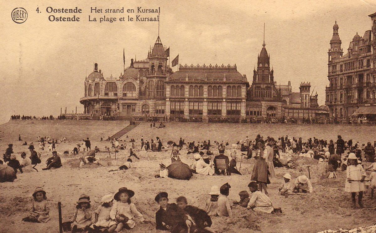 Albert, N° 4. - Oostende - Het strand en Kursaal. Ostende - la plage et le Kursaal. - Strandrecreatie op het Groot Strand nabij de westelijke gevel van het derde Kursaal langs de Zeedijk. Kinderen poseren voor de fotograaf in het interbellum.