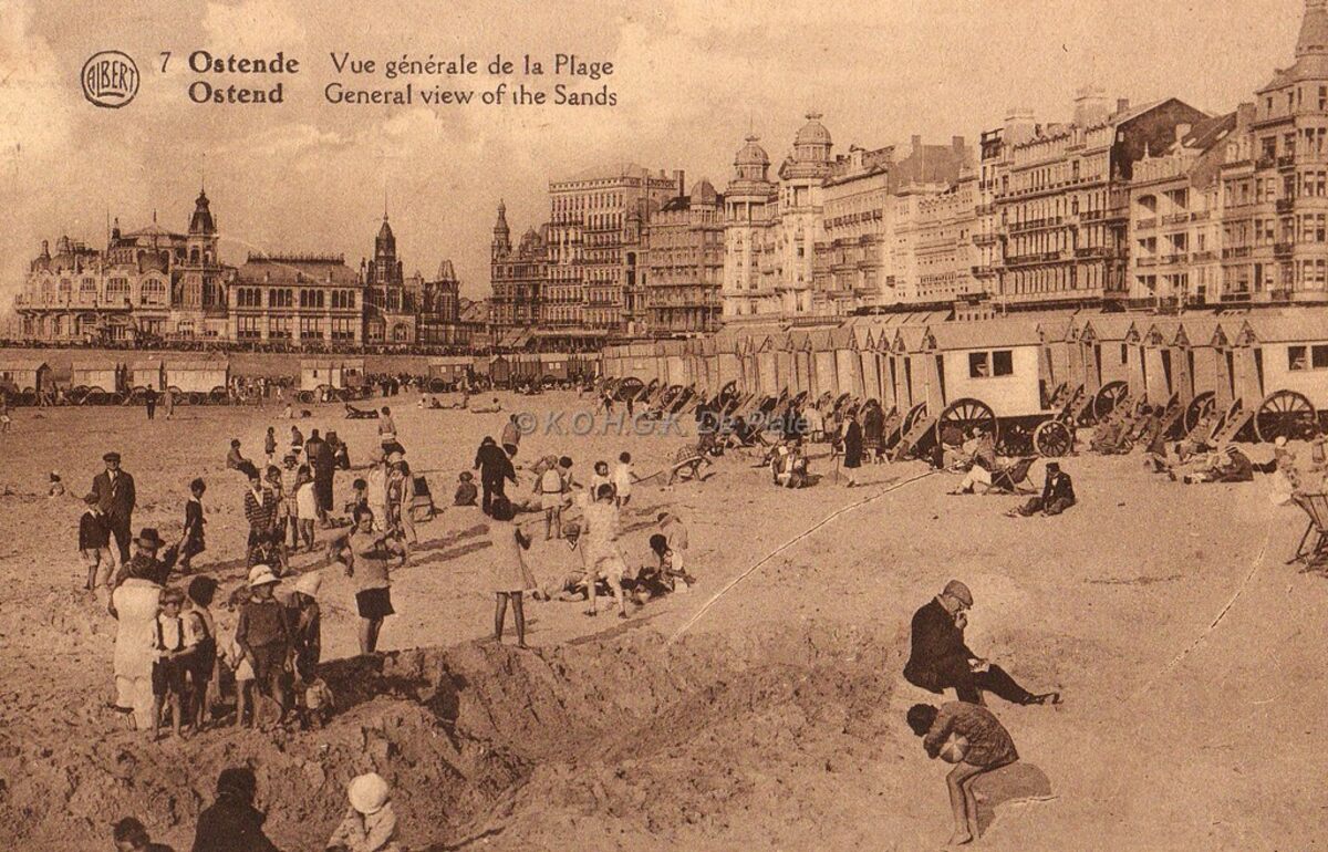 Kinderen spelen op het Groot Strand. Rechts, de traditionele badkarren en de grote hotels langs de Albert I-promenade. Op de achtergrond, de westgevel van het derde Kursaal