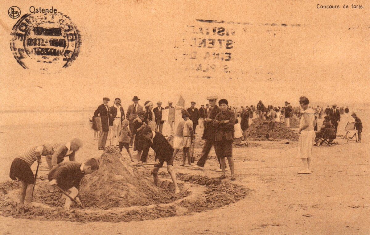 Postkaart : Nels. Plage nr 26. Ostende - Concours de forts. Kinderen bouwen een fort (zandkasteel) tegen de vloed. Wiens fort het langst standhield was gewonnen.