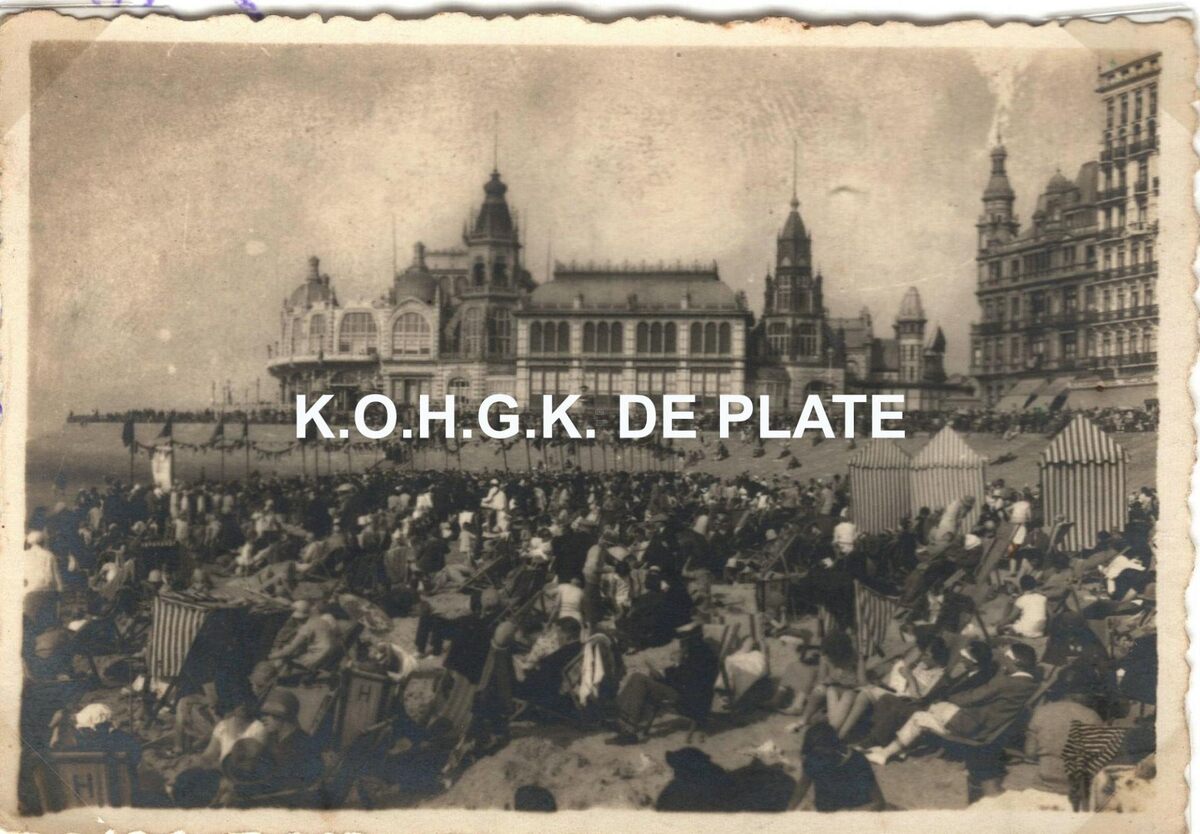 Formaat : 5,5 x 8,5 cm. - Veel volk op het Groot Strand. Op de achtergrond, de westgevel van het derde Kursaal langs de Albert I-promenade
