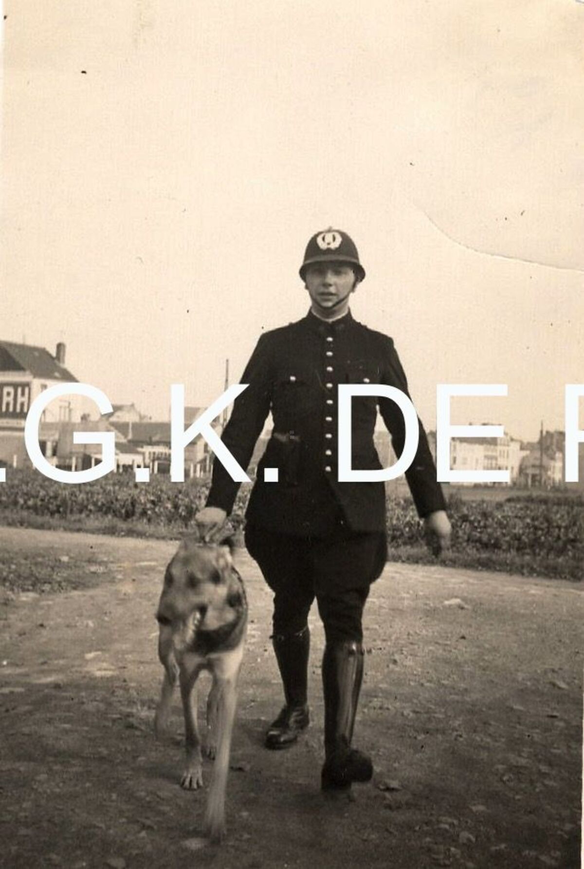 Formaat : 9 x 6 cm. - Politieagent met hond 1938. "Op de achtergond de Nieuwpoortsesteenweg. Duidelijk te herkennen is de noodkerk (barakkenkerk) op de hoek met de Lijsterbeslaan" (Norbert Hostyn)