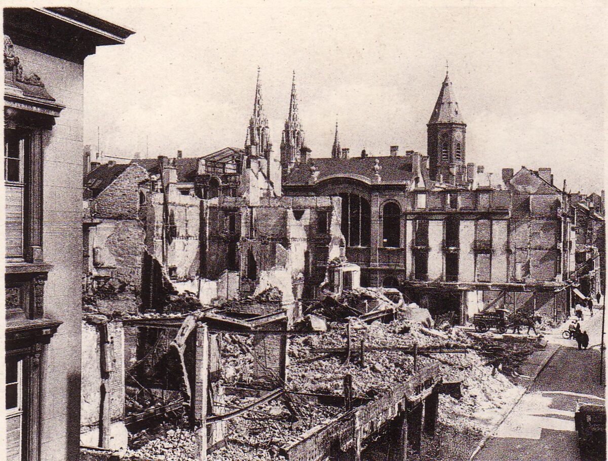 Foto : 9 x 7. Oostende 1940 - De Kapellestraat, met de stedelijke basisschool Albert in de Oosstraat en op de achtergrond links, de torens van de Sint Petrus en Pauluskerk en rechts de toren (Peperbusse) van de Sint Pieterskerk
