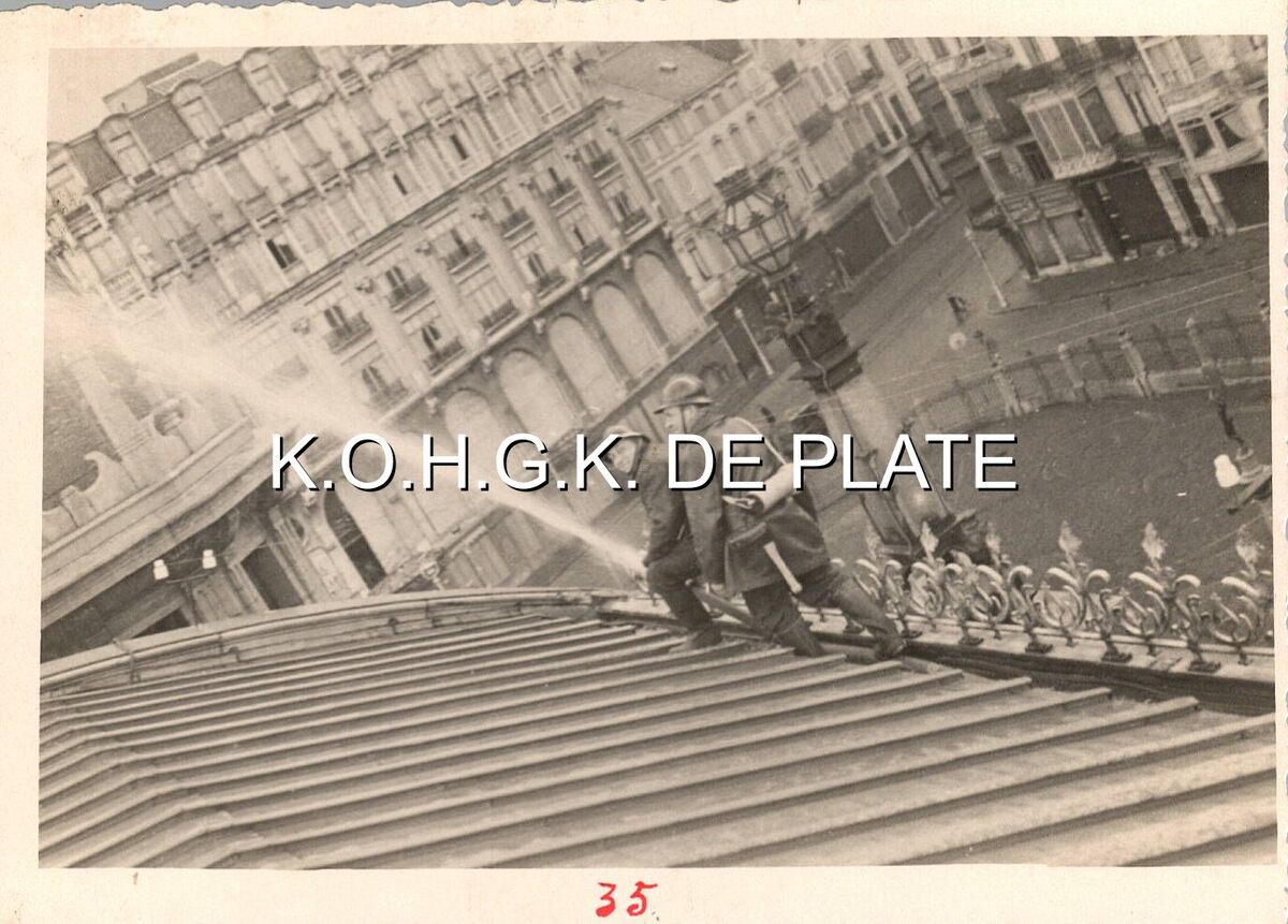 Formaat : 8 x 12 cm. - We zien de brandweer tijdens een oefening op het dak van het westelijk gelegen deel van het Kursaal tijdens het begin van de Tweede Wereldoorlog. Beneden, de Van Iseghemlaan.