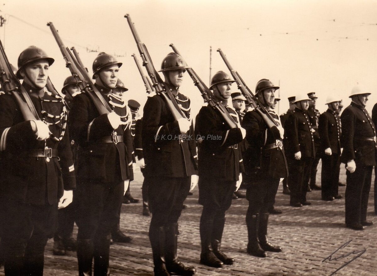 Een detachement van de rijkswacht,er naast een afdeling van de stedelijke politie op het Sint Petrus en Paulusplein tijdens een vaderlandse plechtigheid.