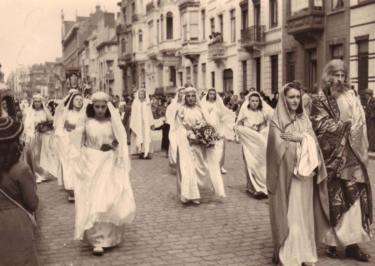 Processie op de Sint Jozefsparochie in de Rogierlaan. Rechts achteraan de kostschool van het Atheneum.