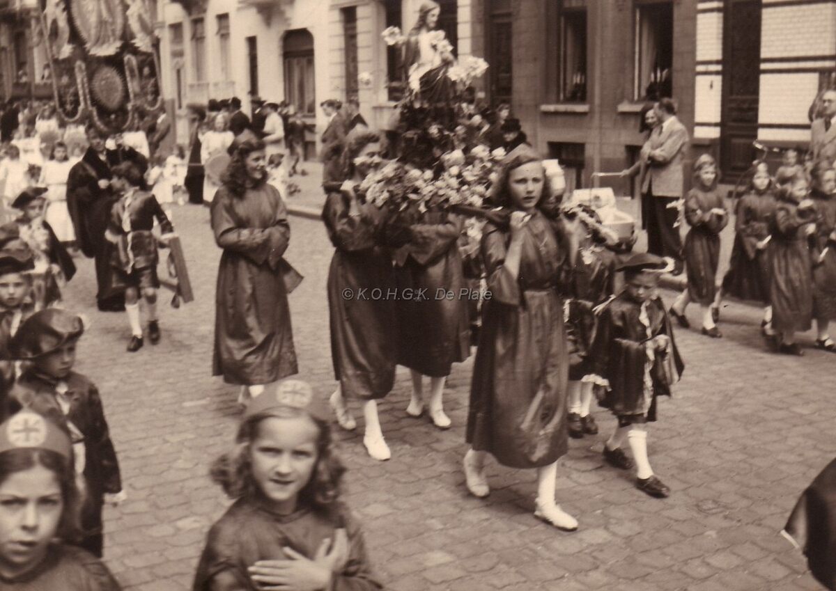 Processie op de Sint Jozefsparochie komt voorbij in de Rogierlaan.