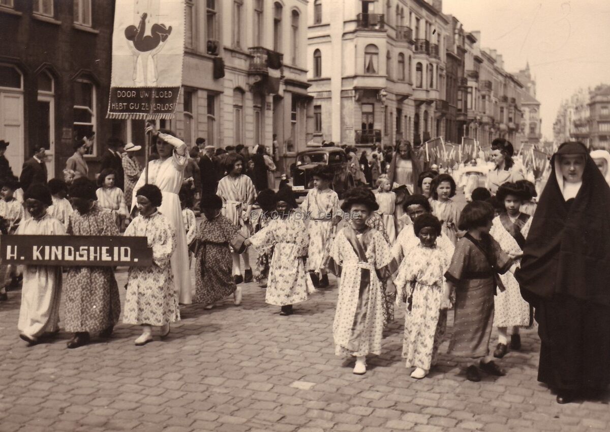 De processie van de Sint Jozefsparochie komt voorbij in de Rogierlaan.sommige kinderen hebben duidelijk een kleurtje gekregen.Ze worden begeleid door een zuster in het uniform van toen.Links hoek van de Euphrosina Beernaertstraat,achteraan het Leopold I plein.