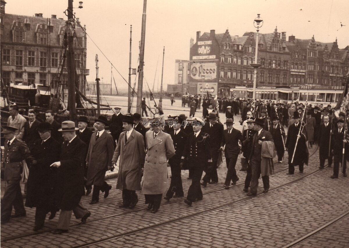 Een stoet oudstrijders op weg naar het stedelijk oorlogsmonument ter gelegenheid van V E dag ( 8 mei) op de Kapellebrug. Links het politiekantoor van het Hazegras aan het Ernest Feysplein.Tweede van rechts op de eerste rij burgemeester Hendri SERRUYS,naast hem Emiel VROOME,schepen op de tweede rij Henri EDEBAU en Roger DEKINDER,schepenen.