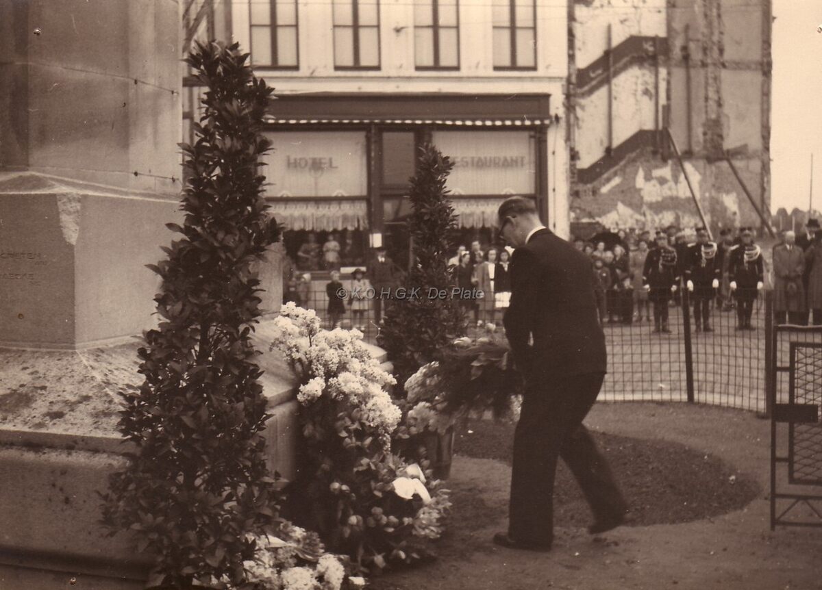 Neerleggen van een krans aan het monument der gesneuvelden op het Sint Petrus en Paulusplein tijdens de herdenking van V E (8 mei) Op de achtergond op de hoek met de Visserskaai zijn nog puinen uit W.O. II te zien.