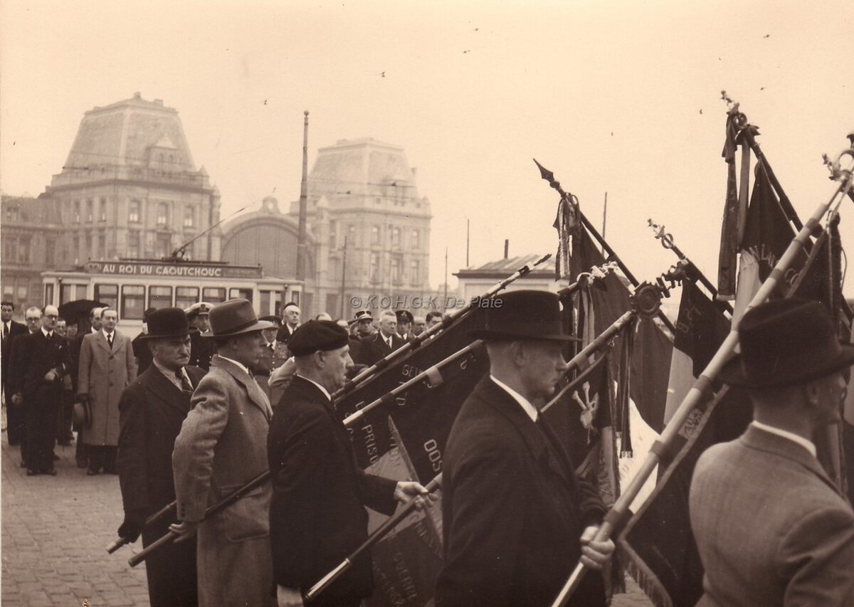 De vaandels van de oudstrijdersverenigingen groeten tijdens de herdenking van V E dag (8 mei) aan het monument der gesneuvelden op het Sint Petrus en Paulusplein.Achteraan passeert een stadstrammetje op de Visserskaai.