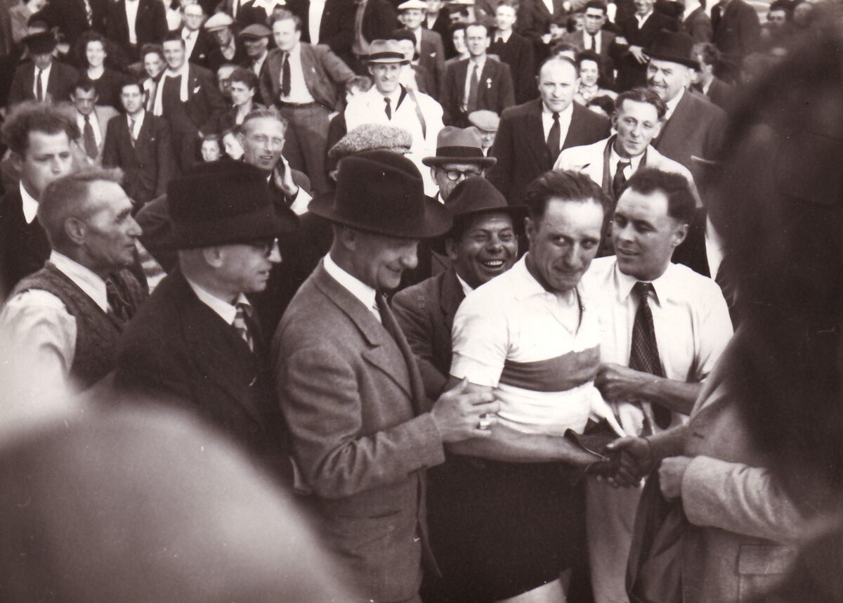 Een ontroerde en druk omringde winnaar van een wedstrijd op de Oostendse wielerbaan.