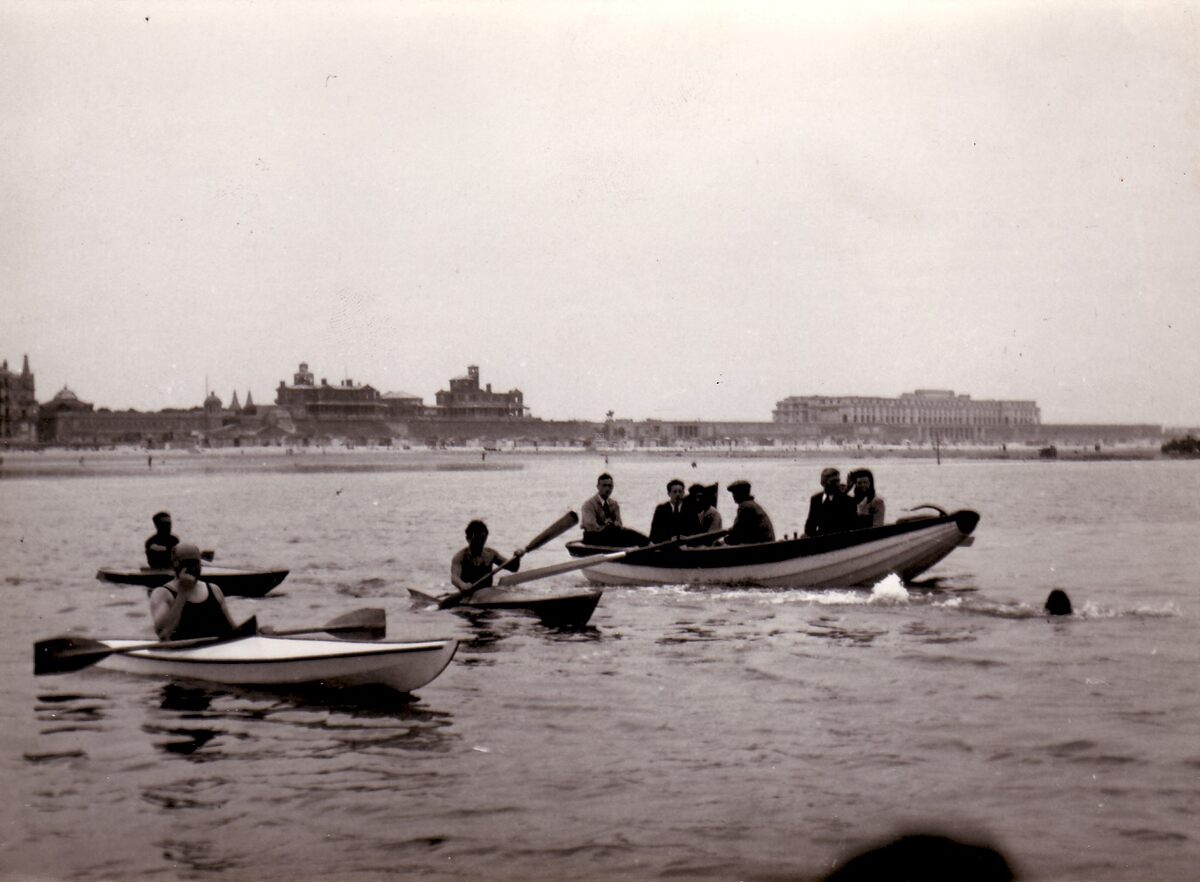 Zwemwedstrijd in zee (Oostendebankrace) ,deelnemer M. WOUTERS en zijn begeleiders.