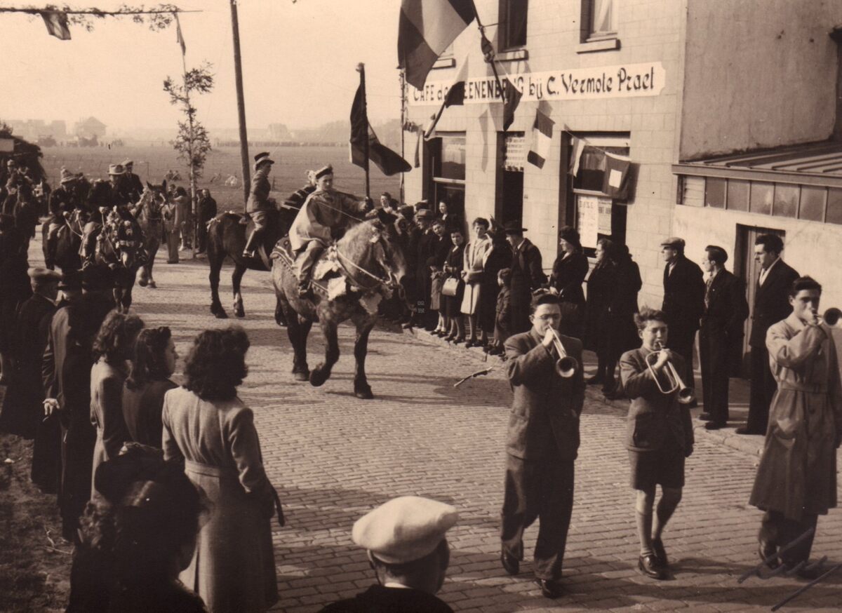 De optocht voor de inhuldiging van de nieuwe pastoor van Stene komt voorbij cafe "De stenen Brug" aan de Steense Dijk.
