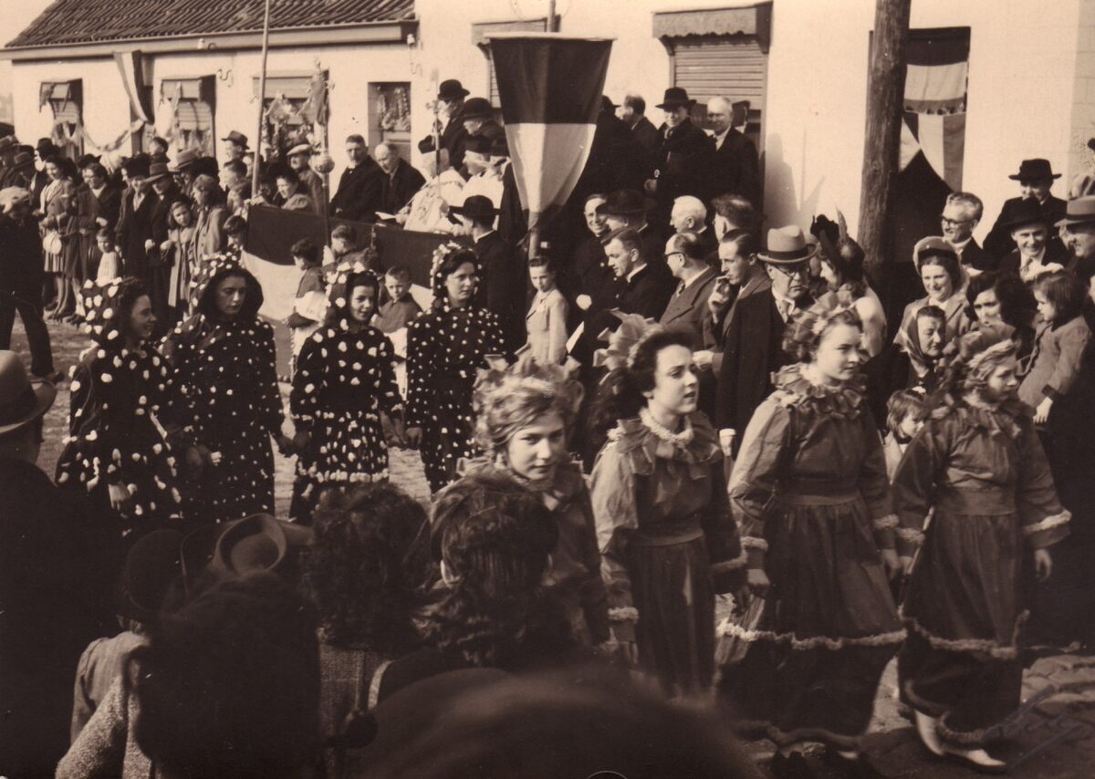 De vrouwelijke jeugd van Stene loopt mee in de inhuldigingsstoet voor de nieuwe pastoor.