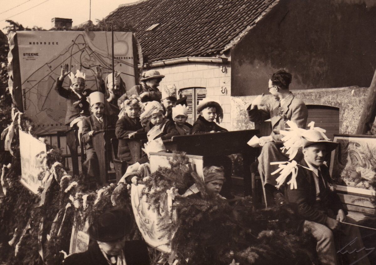 De "braafste" schoolkinderen en hun "meester" op een wagen in de inhuldigingsstoet voor de nieuwe pastoor van Stene.(Zie ook 2014/3532)