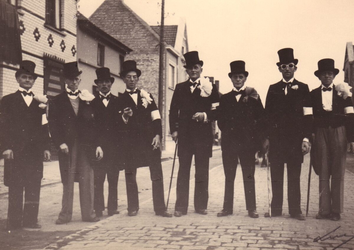 De harde kern (fuifnummers ?) van Stene in de inhuldigingsstoet van de nieuwe pastoor.
