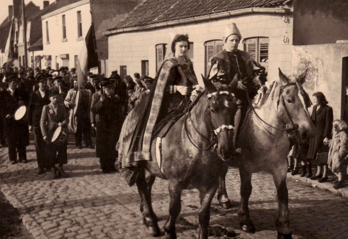 Steense dijk;Ruiters in de inhuldigingsstoet van de nieuwe pastoor van Stene.
