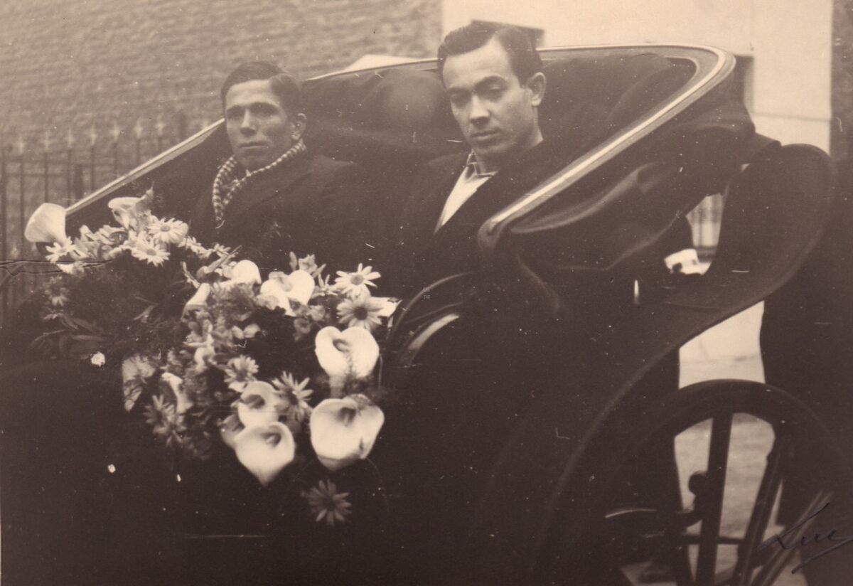 Een openkoets of "caleche"met twee onbekenden in de inhuldigingsstoet voor de nieuwe pastoor van Stene.