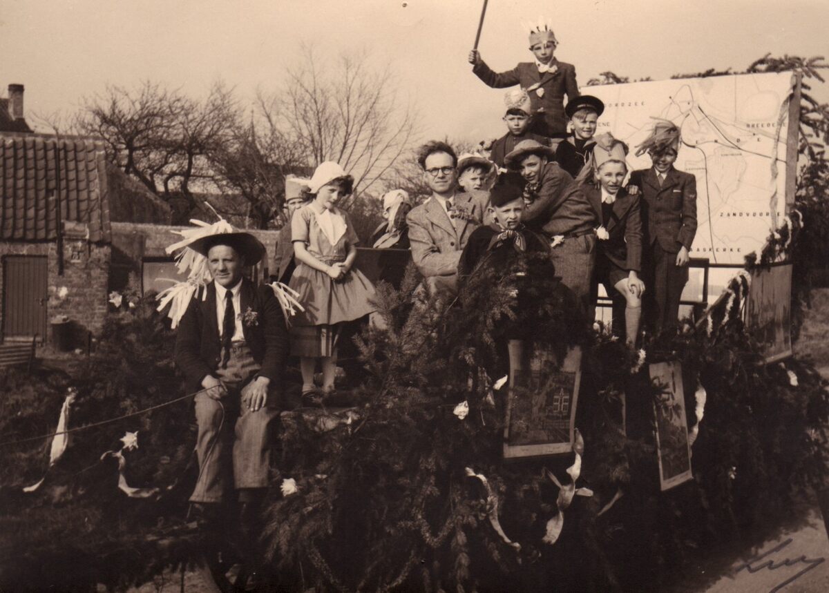 Een praalwagen met de schooljongens van Stene in de inhuldigingsstoet voor de nieuwe pastoor.(Zie ook 201/3515).