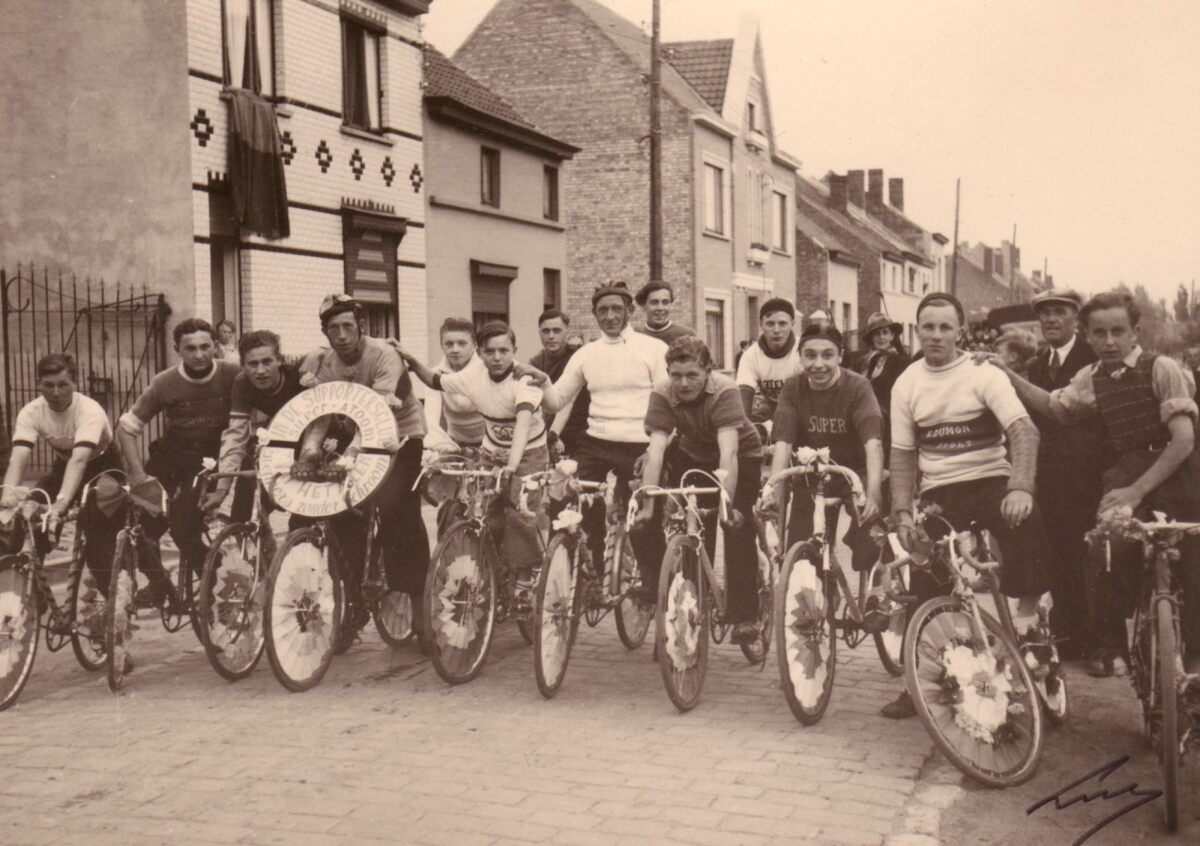 "Super-atoom" een wielersupportersclub met versierde fietsen in de optocht bij de inhuldiging van de nieuwe pastoor van Stene.