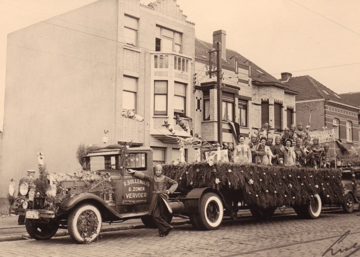 Prinses Elisabethlaan Bredene een vrachtwagen van de firma Bollenberg met middeleeuwse boogschutters uit een stoet.