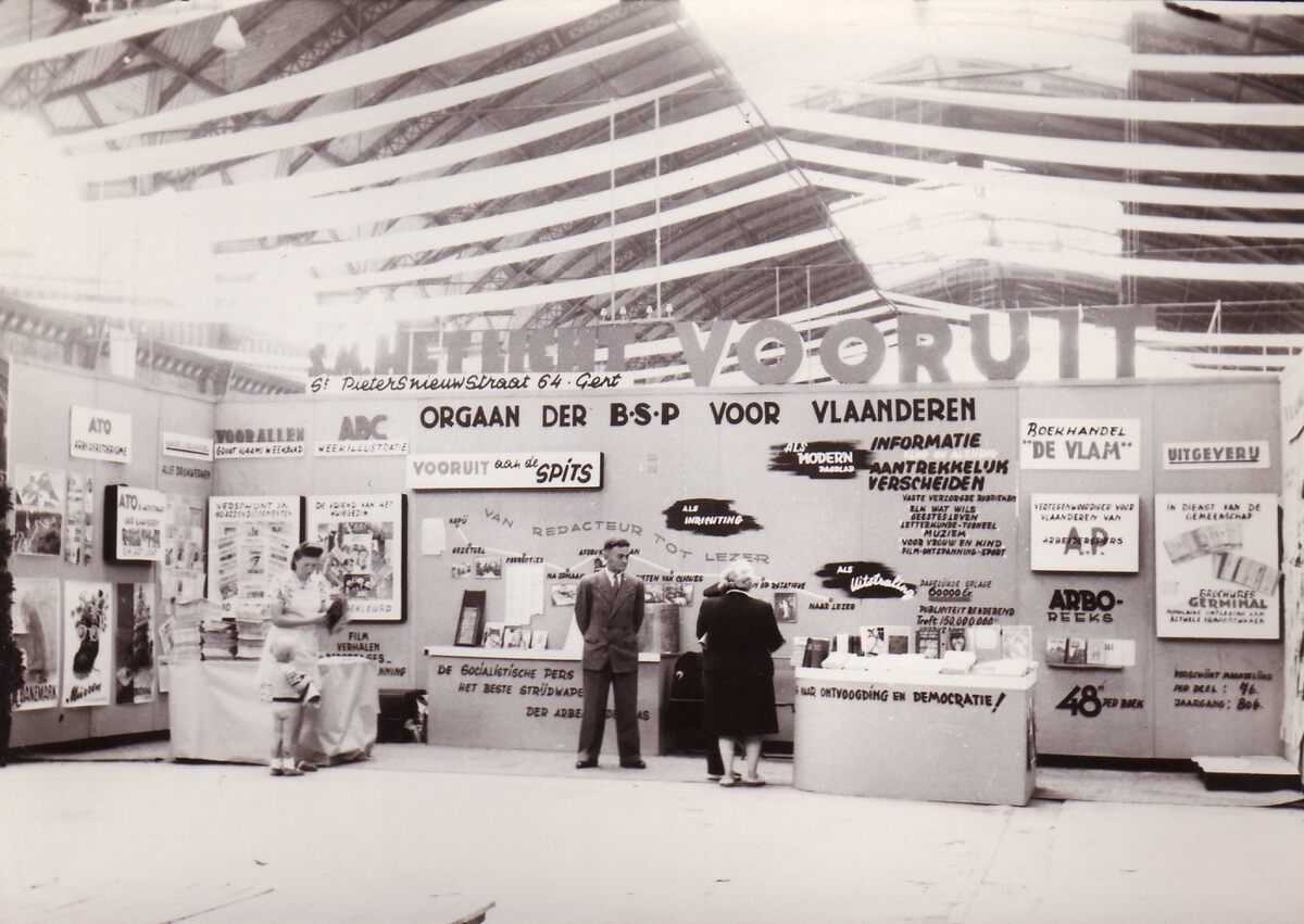 Stand van de socialistische partijkrant "Vooruit" op de "Rode Kermis" in het Oud Station (Ernest Feysplein) ter gelegenheid van de 1 mei betoging 1947.