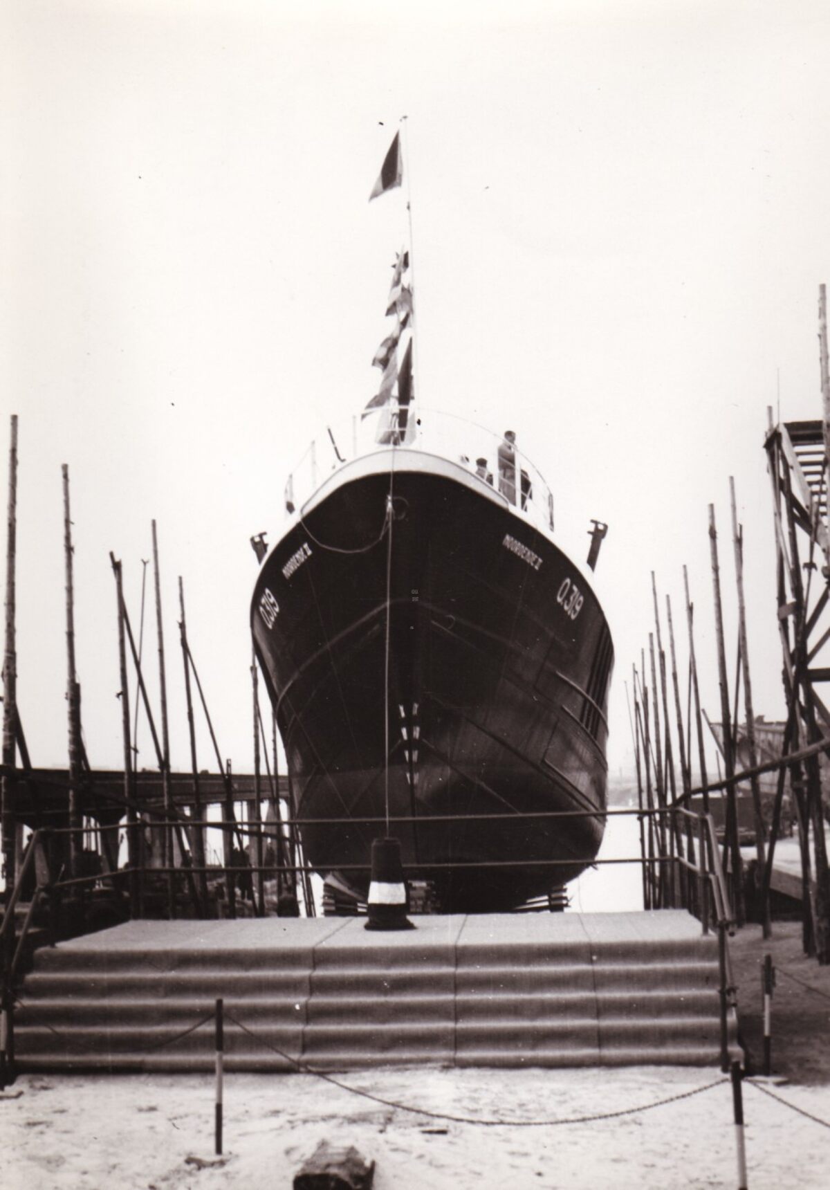 De O.319 "Noordende II" op de helling voor de tewaterlating bij de scheepswerf Beliard-Crighton & C°. Stalen motortreiler gebouwd voor de rederij Noordende.