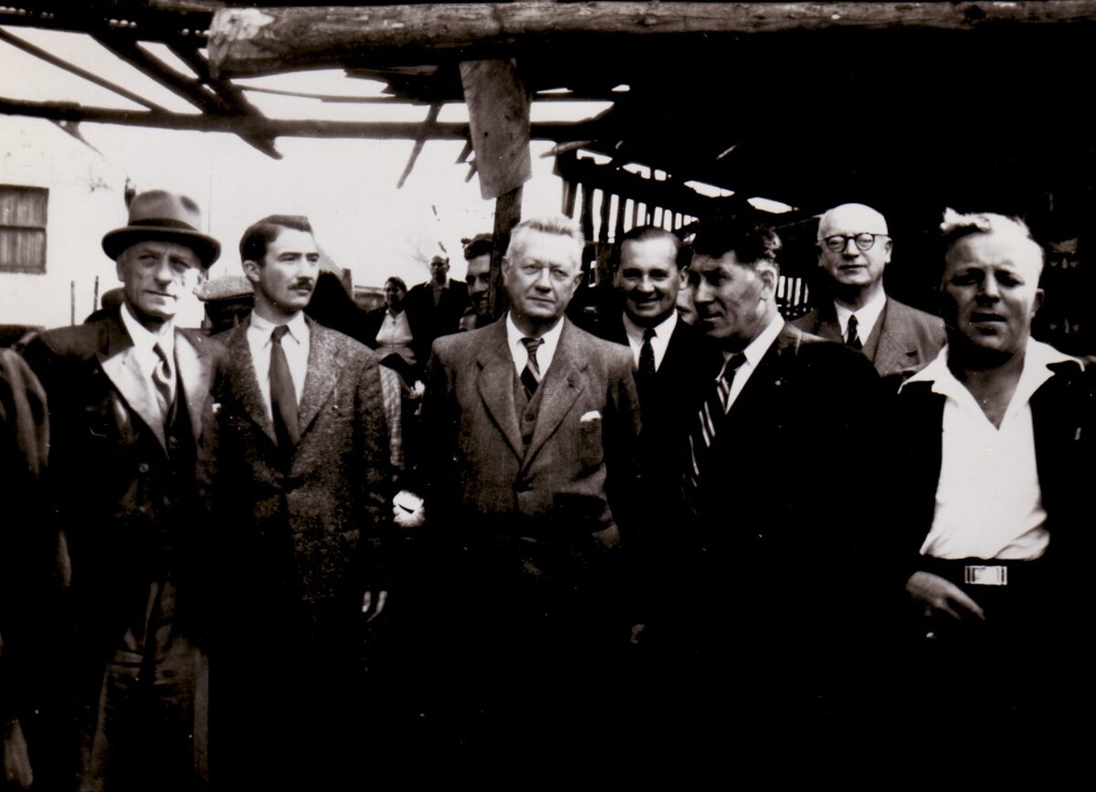 Een tewaterlating in het derde, thans verdwenen, handelsdok. Van links naar rechts Henri EDEBAU, Roger DE KINDER, Emiel VROOME, onbekend, Richard PANESI (scheepsbouwer), Michel SURMONT en onbekend.