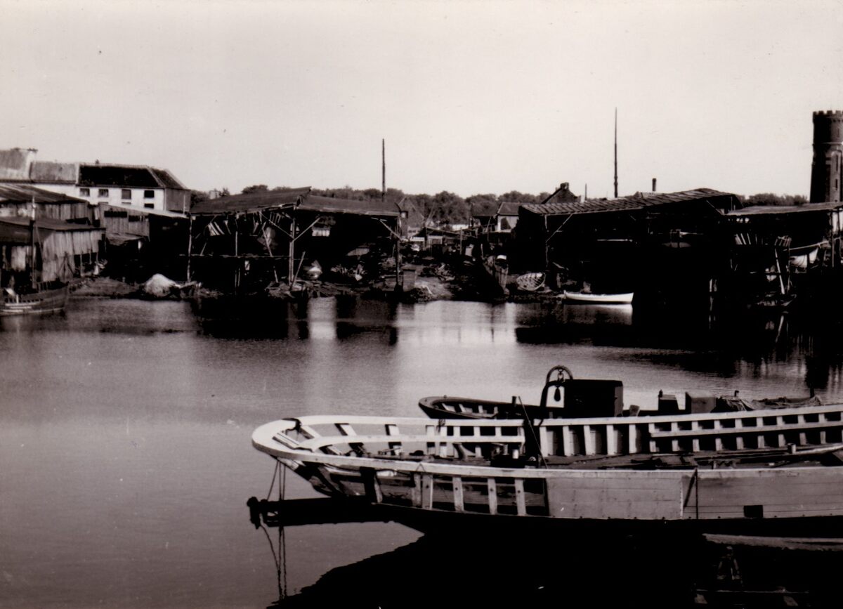 De scheepswerven aan het derde handelsdok (nu verdwenen) : van links naar rechts werf DEWEERT, werf PANESI, werf DENYE, werf HILLEBRANT en werf LOY. Op de voorgrond een pas van stapel gelopen visserssloep, achteraan de Perronstraat en rechts de oude watertoren.
